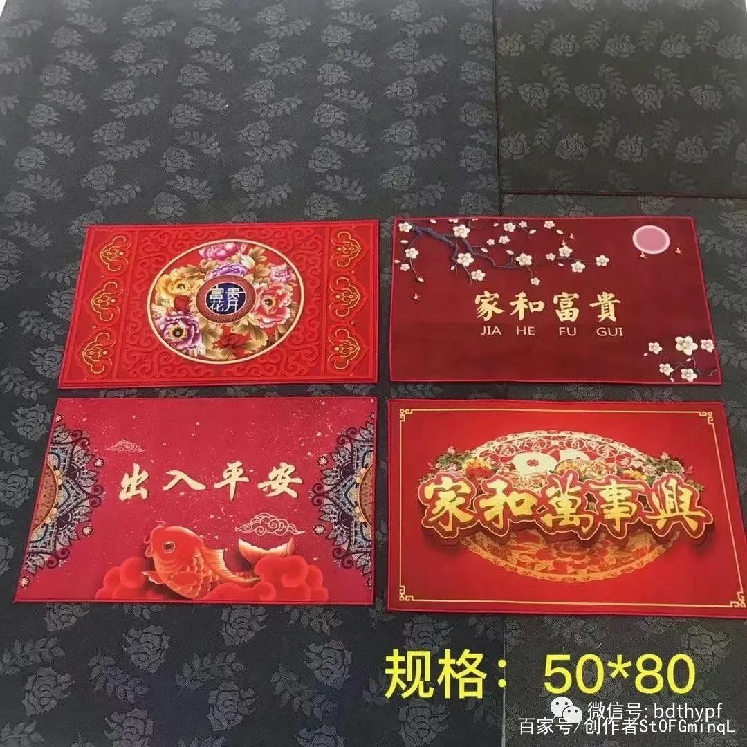 名称:居家地垫风格:中式材质:水晶绒面料 反面滴胶防滑设计适用:大门口 室内门 厨房门口 卫生间门口(各个场景)价格:50*80批发7元/块厚度: 6-7mm款式:10几个款式随机混搭起批量:200条